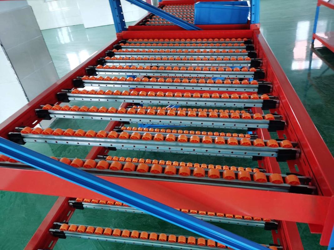 흐름 레일은 엔지니어 피치에 고정되어 팔렛을 래크의 상단에 배치하고 배하 끝으로 아래로 미끄러질 수 있습니다.